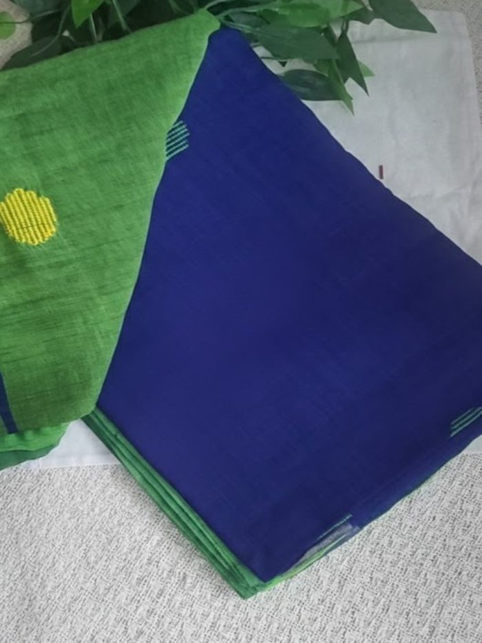 Enhance your ethnic collection with this beautiful green and blue cotton saree, elegantly designed with circle woven bootas all over. The refreshing green base brings a lively and graceful appeal, while the blue accents add richness and depth to the overall look.