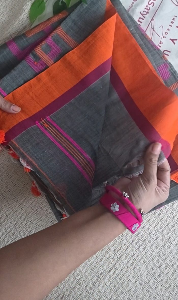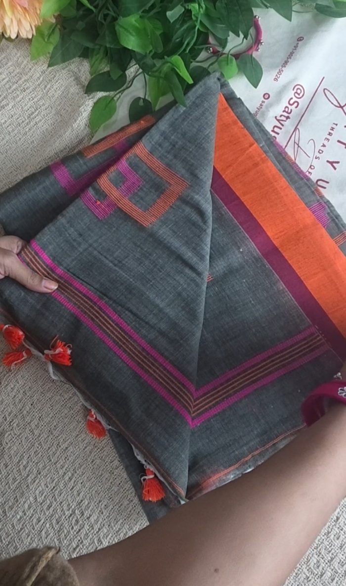 If you love subtle base tones with a playful pop of color, this grey cotton saree is a beautiful choice. The soft grey base keeps the look elegant and refined, while the pink and orange geometrical weaving adds a vibrant, artistic touch that instantly lifts the saree.