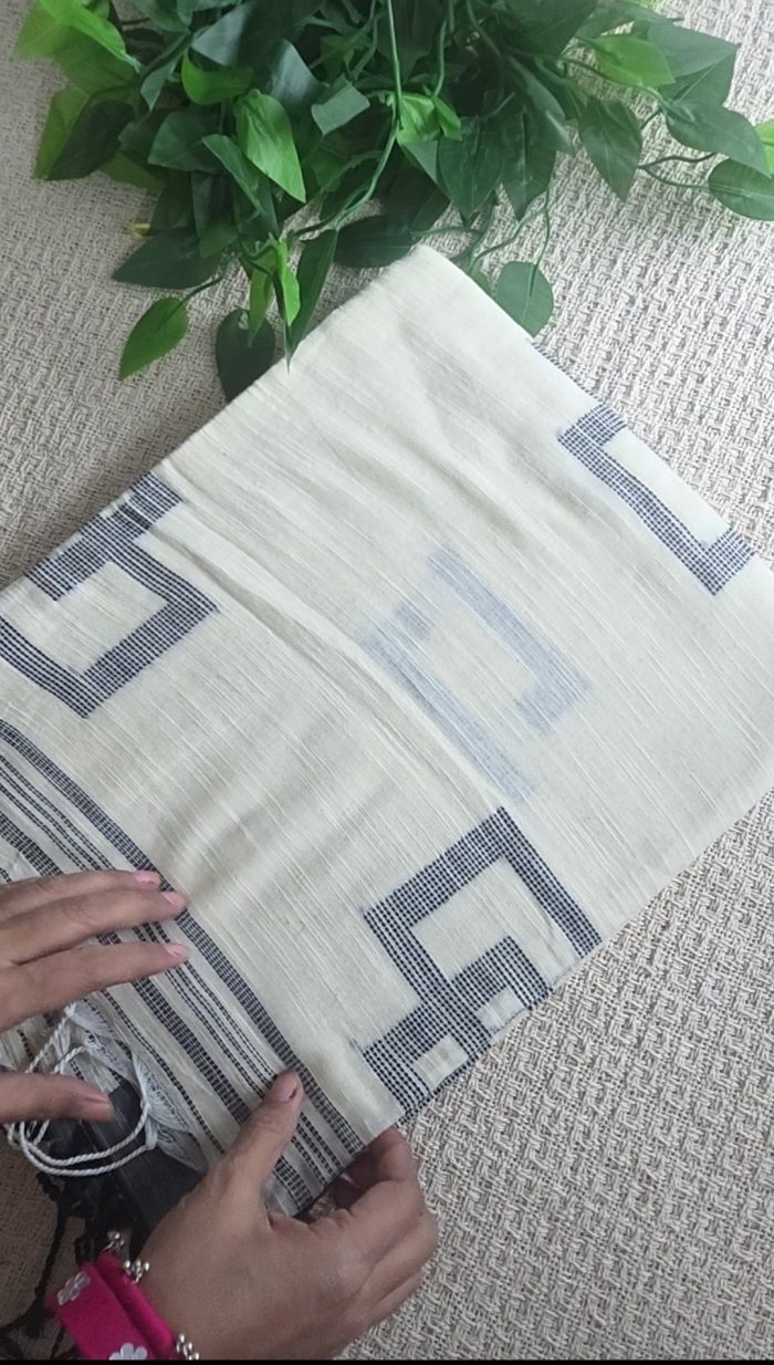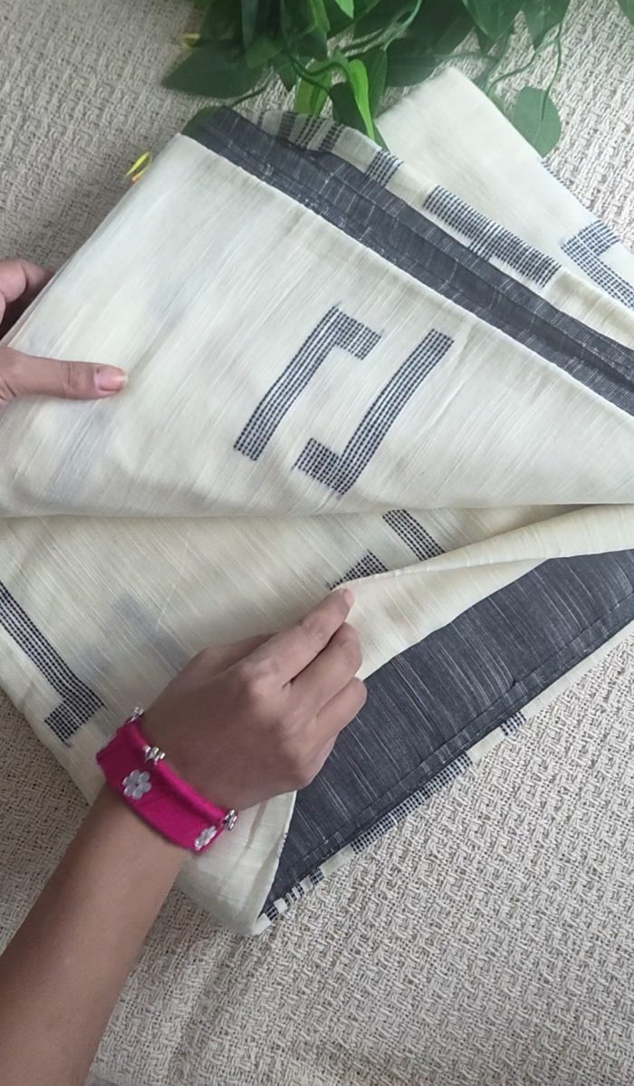 If you appreciate minimal elegance with a modern touch, this off-white cotton saree is designed just for you. The soft off-white base beautifully contrasts with striking black geometrical weaving, creating a look that feels both timeless and contemporary.